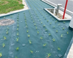 極小根鉢苗使用で防草シートへ簡単に植栽できる